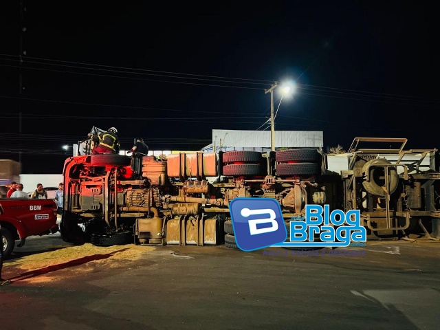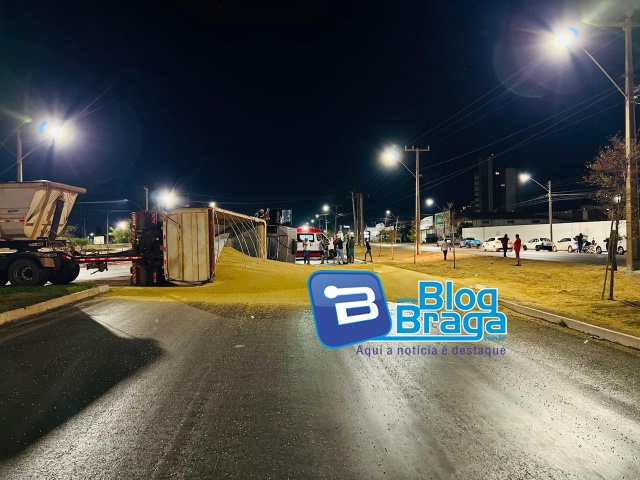 Uma carreta rodo caçamba carregada com soja tombou na noite desta quarta-feira (01), por volta das 23h55, na BR-242, trecho urbano de Luís Eduardo Magalhães, nas proximidades da subestação da Coelba.